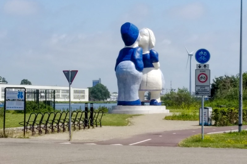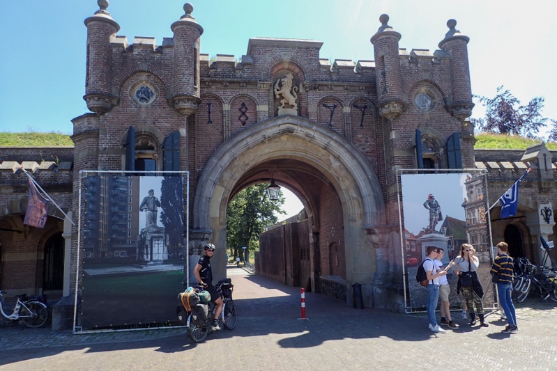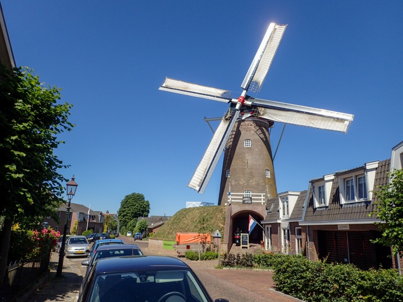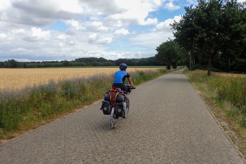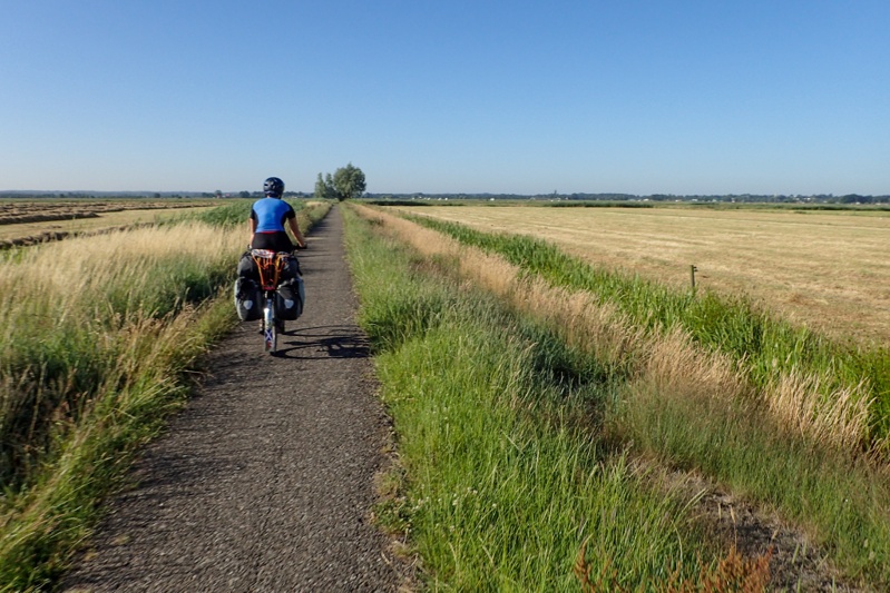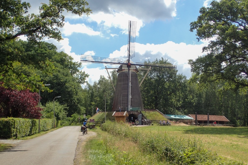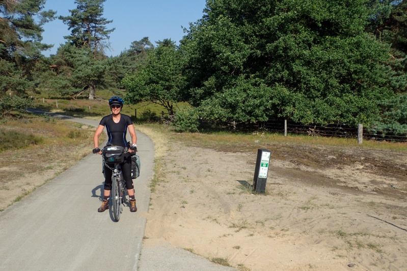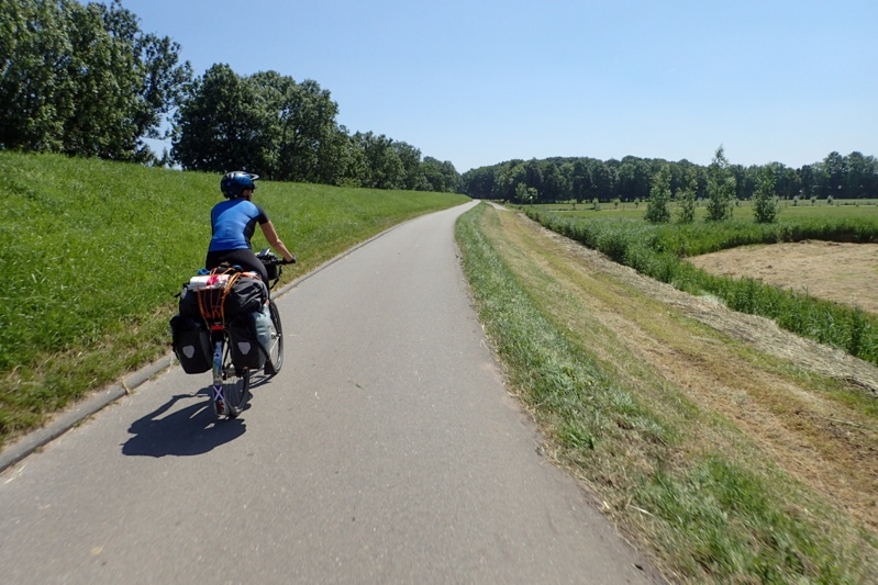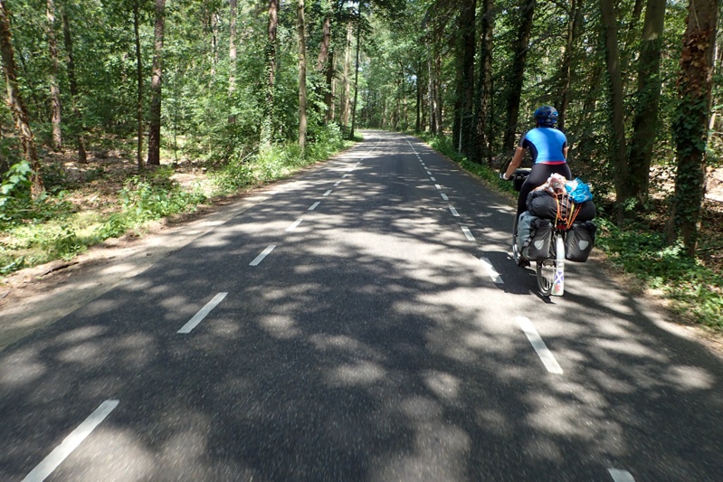 The diversity of the landscape in the Netherlands is always surprising as we experienced on a previous trip. When you think of the Netherlands you automatically think of a flat country with picturesque villages, but just today we cycled uphill, through beautiful forest glades and passed very sandy (high) areas. An example of this is Rosendael Woods, after Rosendael Castle where almost all the roads are car free and the place was full of road cyclists in little packs, obviously due to the little climbs that you get there. It was such an experience to ride there. After this we were back into rural Netherlands with farms and little canals. We stopped to buy a bottle of Coke, yes, our first of this tour! Must be hot! We drank it in a little park and watched the locals cycle past. After this we caught a little ferry across a river and then spent some time cycling along a dyke. We passed through various woodlands again on little dirt tracks. All the while there were elderly couples, families with small children and family groups with grown-up children, all out on their bikes just enjoying the day. We would often pass a couple who had stopped at a bench for a bite to eat, clearly out for the day on their bikes. We even passed an old man who had stopped and sat on a bench in the shade and fallen asleep. We love the atmosphere here when cyclists are the majority.