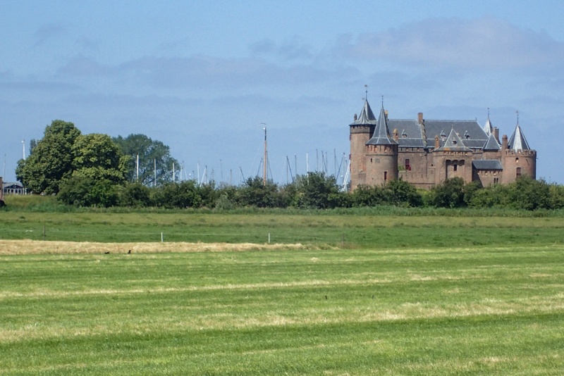 We left the hotel at 10:00 and so we missed rush hour on the cycleways of Amsterdam. Our route was mainly coastal. At the start we travelled east through the Centraal Station precinct. The bicycle parking has to be seen to be believed. Even though the route was quiet we were still in the mix with other cyclists and it is amazing to ride like this. Everyone goes at the same pace, no one is overtaking or "going for the gap". It's just like being in traffic in a car and going at the speed limit. It was a sunny day and the cycle route was edged with wild flower meadows and grass. There are many benches scattered around and we stopped to have our flask coffees at one. Muizen with it's castle was a highlight as were the other villages we rode through. Many had marinas and all were pretty and neat.
