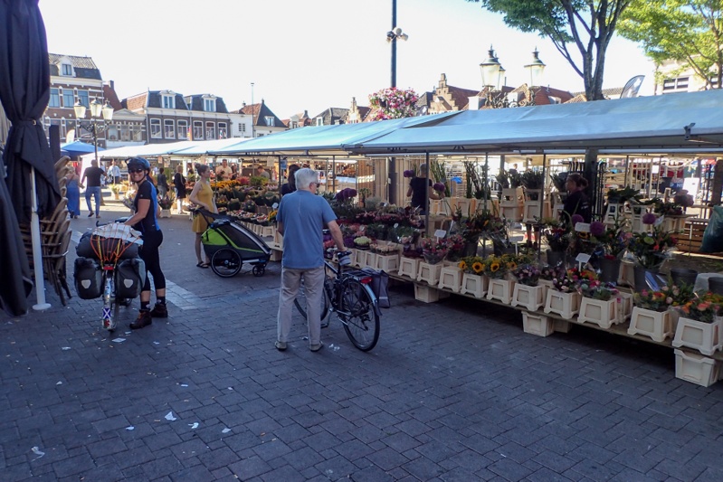 It was a hot day today, 30 degrees was forecast and that was spot on (in the shade). We thought idly about an early start but didn't feel motivated to rush. We marvelled at how quickly the weather changes, in a matter of days you look upon thick woolen jumpers in disbelief that you would ever need such a thing and start mumbling about it "taking up space" in your pannier. The day was really too hot for cycle touring but perfect for everything else. Hardly any wind, sublime views of the lazy Dutch countryside with fields of wheat, corn and cows almost always seen whilst riding on a polder. Thre cycleways continued to take us wherever we wanted to go. First stop Amersfoort where we stopped at the glorious Saturday market. In over two months travel we have not come across one market and so we were pretty excited. The town of Amersfoort is almost too quaint to bear. The market was set up in the old town square. We navigated our way to it by following all the people on bicycles with empty panniers who were going there too! The flowers were beautiful, the baked goods delicious and the fruit perfect. We bought fresh juice in glass bottles, freshly roasted nuts, bread covered in pumpkin seeds, and peppered sausages. We rode about 2km and then stopped to eat some of it. The main cycle highway into Amersfoort is called the Jaagpad. We sat on a bench by the Jaagpad and watched many people come and go by bike. We stopped a little while later at a museum set up in an old German bunker which was interesting.