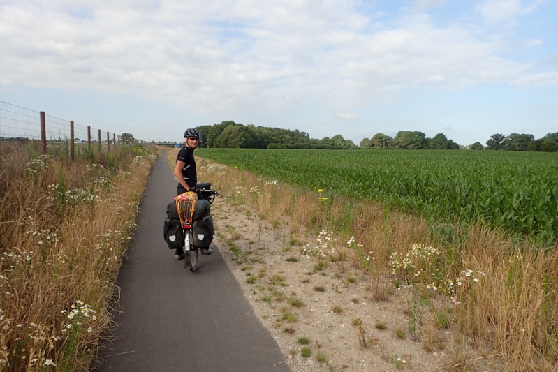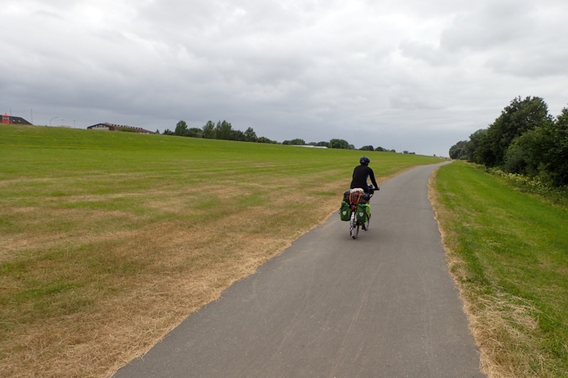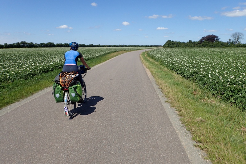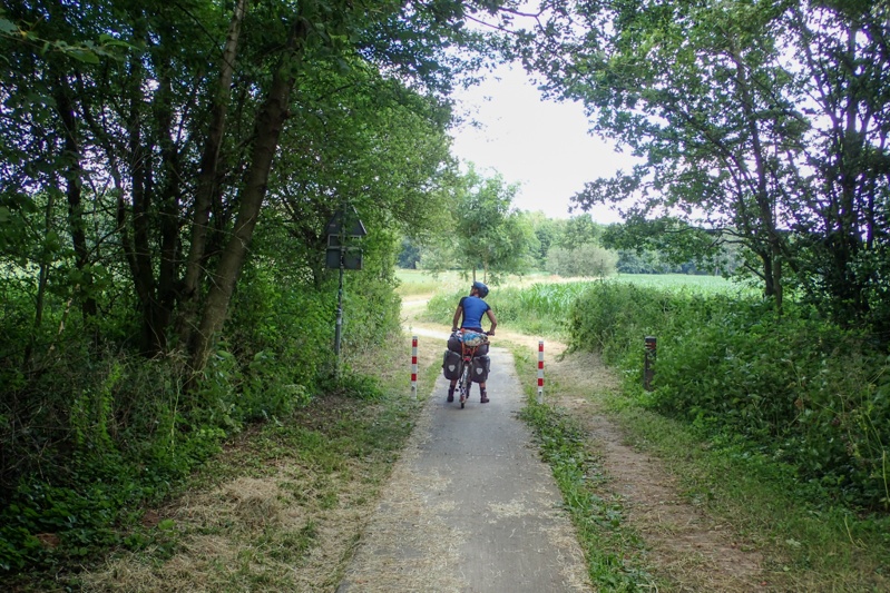 Another pair of cycle tourists arrived last night after writing, with a small baby that one of them pulled along in a trailer. We are starting to see more cycle tourists which is interesting. The baby was very vocal and seemed excited to be there. Probably just stir crazy from being bounced about all day! We got an early start at 07:30 as there was to be a head/cross-wind today which would grow in strength. We made good progress today, again a combination of quick cycleways along main routes and cycle routes which deviated on all sorts of terrain. It makes it interesting to decide at an intersection which way to go. It was quite cool on the bike today but the sun came out now and again. We have had cloudy weather for many days now, those first three hot and warm days cycling out of Amsterdam have been followed by pretty average weather. At least it's not UK grey though, the clouds tend to be big, white and fluffy. We stopped after 30km at a football field for raisin bread and continued making good time. Something that really stands out for us about this part of Germany is how very quiet it is. I know that I have remarked on this before, but it feels strange to cycle down main streets of villages and see no one at all. The villages are obviously lived in and most are very pretty with well-tended gardens full of summer blooms. Maybe they all leave early for work in nearby towns?
