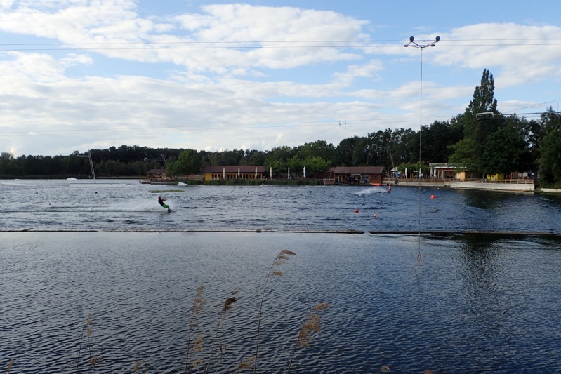 We were soon at our campsite, without suffering any allergic reaction. It was, as expected, huge and German. On a lake, 450 pitches. All the bells and whistles, but grass bone dry and brown from the recent heat. We are paying EU 30 for the pleasure. No cyclist rate here, even in a country that is well-known as a cycle touring destination, or at least known for bicycles! We did find a shady spot though and took a walk later. It was interesting to see two water skiing devices with no motor boat required. There was a huge rotating cable pully device above and each person grabbed onto a rope by a handle and was whirled round and round. Sort of like a ski chair lift, but for water skiing. We were amazed! Tomorrow we are going to try to get all the way to Bremen. We are enjoying the weather now, it is cool but comfortable.