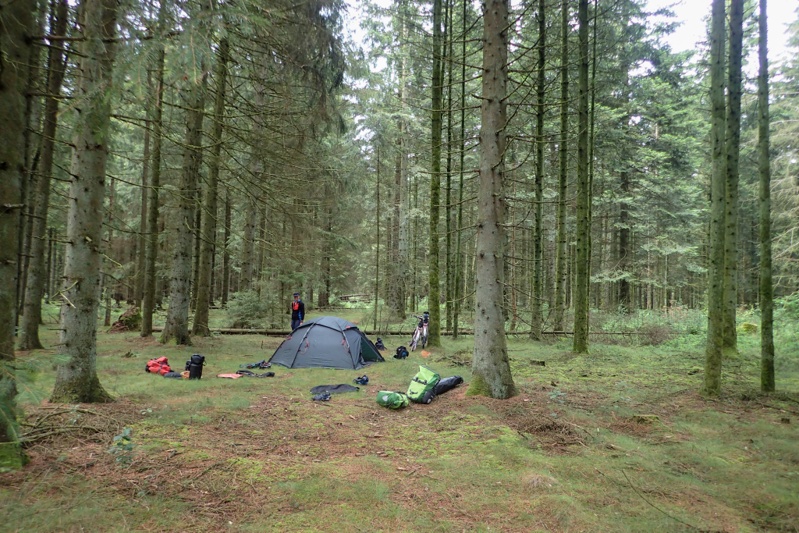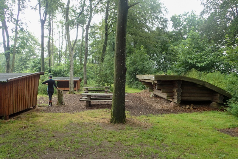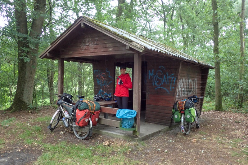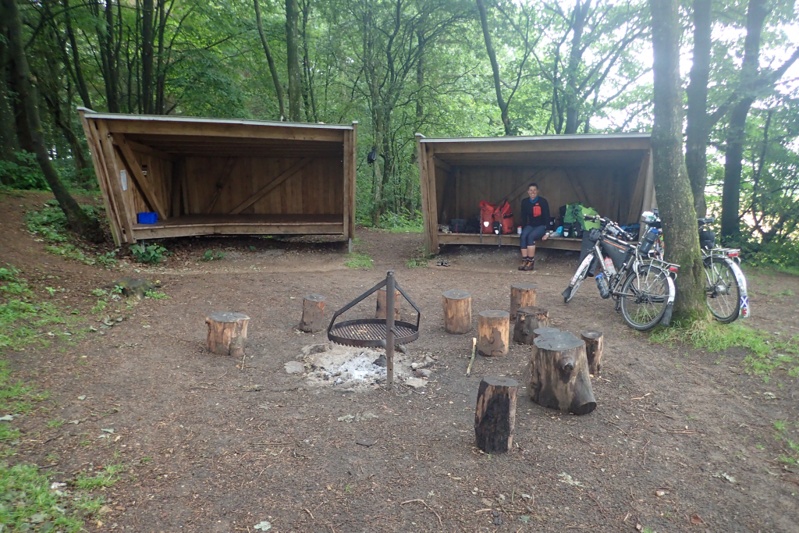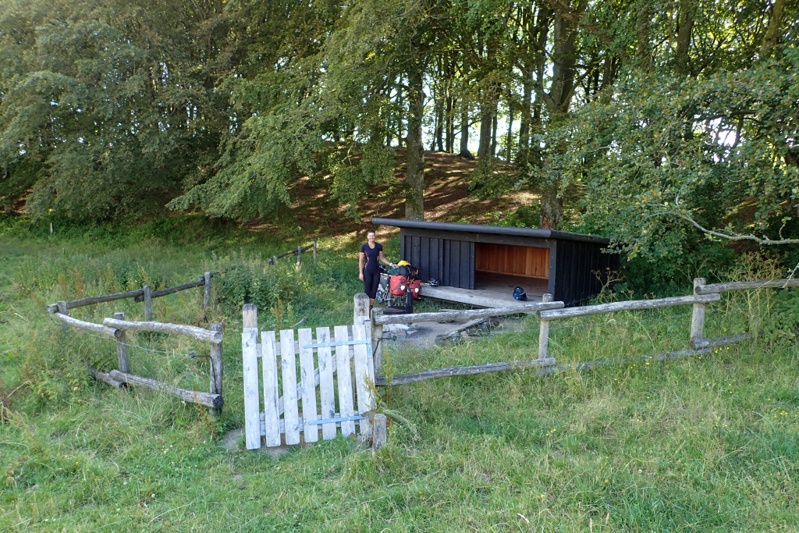 We pitched our tent inside one of the shelters at about 19:00 and were in bed around 21:00 due to more rain, when of course two other cycle tourists arrived and proceeded to talk very loudly about all sorts of rubbish (one was particularly loud). They were British and seemed opinionated, particularly about a weather app they were using which had disappointed them apparently. Eventually Mike asked him to pipe down. Then two Danish cycle tourists arrived at 22:00 and all four men slept in the shelter next door to ours. We did have a peaceful night eventually.