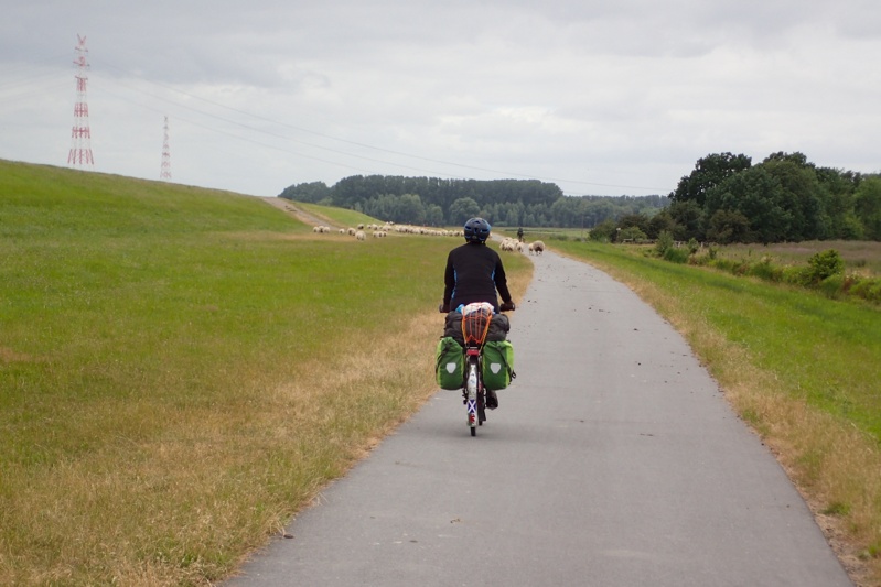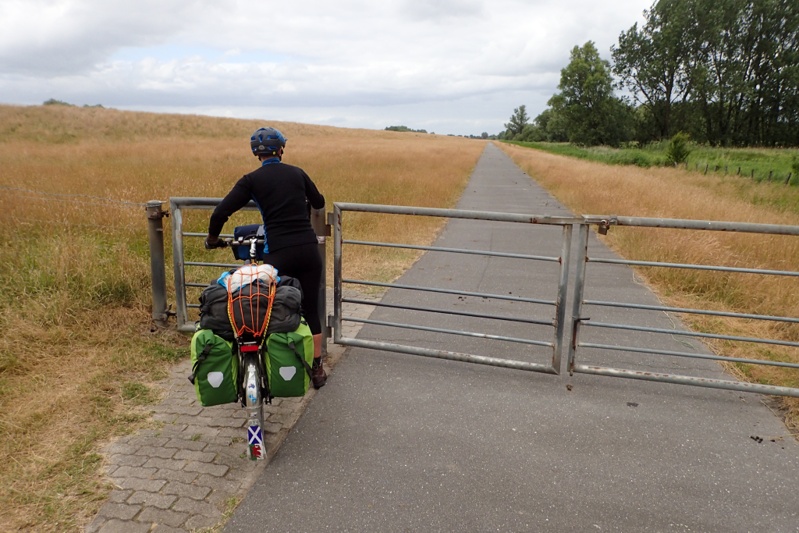 We stopped to buy a pizza for lunch due to the supermarkets being closed on Sundays. Then we had only 22km to ride to our campsite. The ride was all along a polder scattered the whole way with sheep, who in turn had scattered their turds everywhere! We had a monstrous headwind along this section. Somewhere in the middle it got more manageable and then kicked up towards the end. All the way along the polder there are sturdy metal pedestrian gates which you have to push open and pass through. German sheep are like Dutch sheep - completely unworried by bicycles, for obvious reason. Unlike British and Irish sheep that run for the hills the minute they see you!