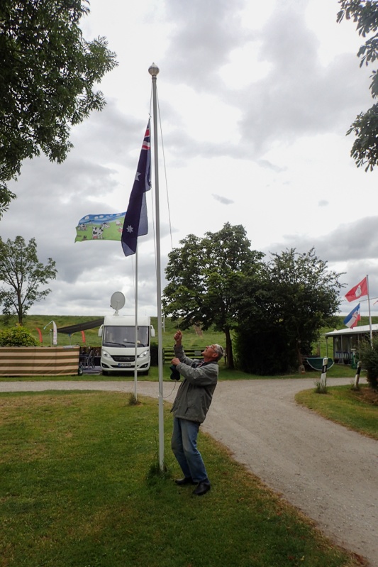 We still enjoyed the polder ride, even with the wind. Would have been even better without it though! We dropped off the polder straight into our campsite. The manager was charming and wanted to ask us all about Australia. Once we had paid he said, "Now you sit down there and let me ask you questions". Then he pulled out a box of labelled flags. We had noticed when we arrived that there was a Dutch and a Swedish flag flying. He decided that as the Swedish people were leaving tomorrow, he would put up the Australian flag in our honour! It was really fitting as when we came out of reception, there were two more Australian cycle tourists who had arrived! Once we had pitched our tents he came out and called us both over for a flag raising ceremony! We spent some time chatting to Dave and Adele, the other Australians. They were interesting to talk to. They started their tour in Prague and will end in Oslo.