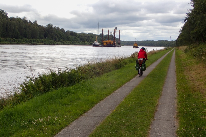 The last 25km of the ride was along the Nord-Ostsee-Canal and we caught a ferry over this, the 25th ferry of the tour and then had a few kilometres to go to our campsite. We stopped briefly at the village butcher for some salami. The campsite is on the Eider River and is quite informal. There are some other tenters, two of which are cycle tourists. I forgot to say yesterday that we saw our fourth robotic lawnmower and clocked over 5,000 km for the trip so far. Also, Mike did some field maintenance on the bikes in replacing the Rohloff oil.